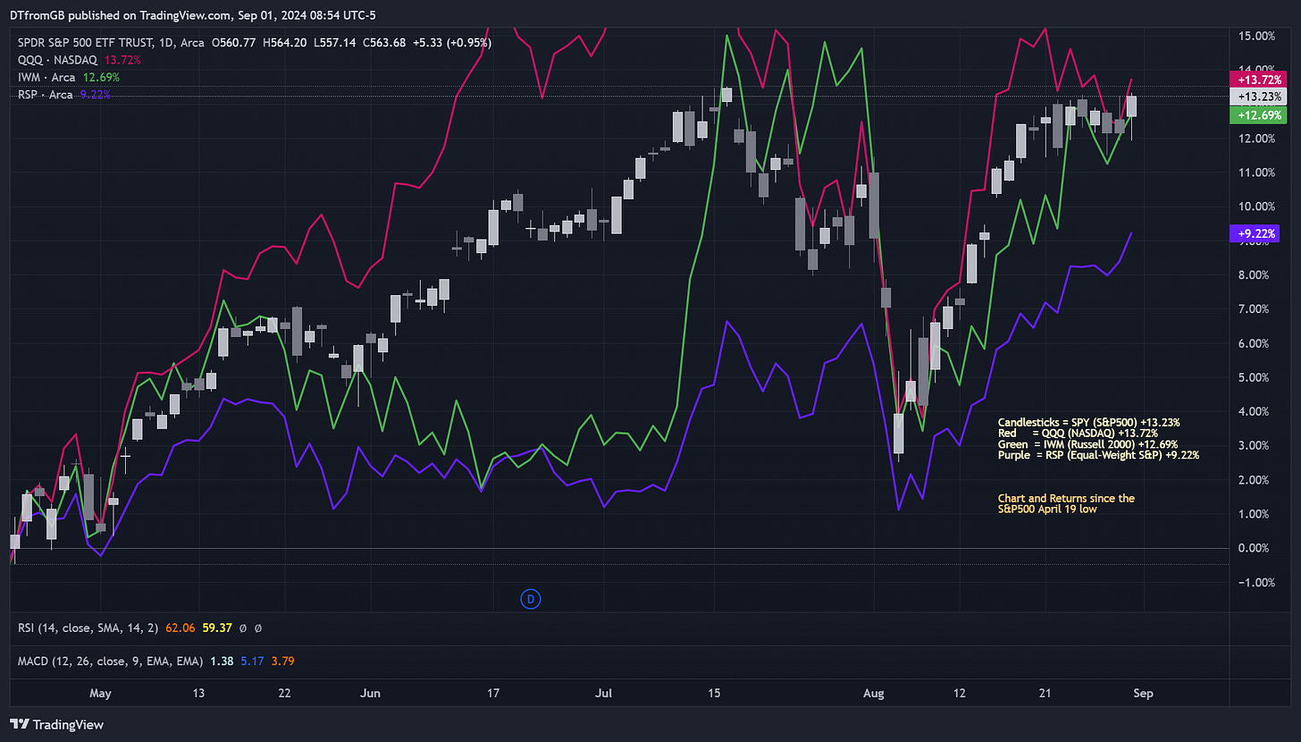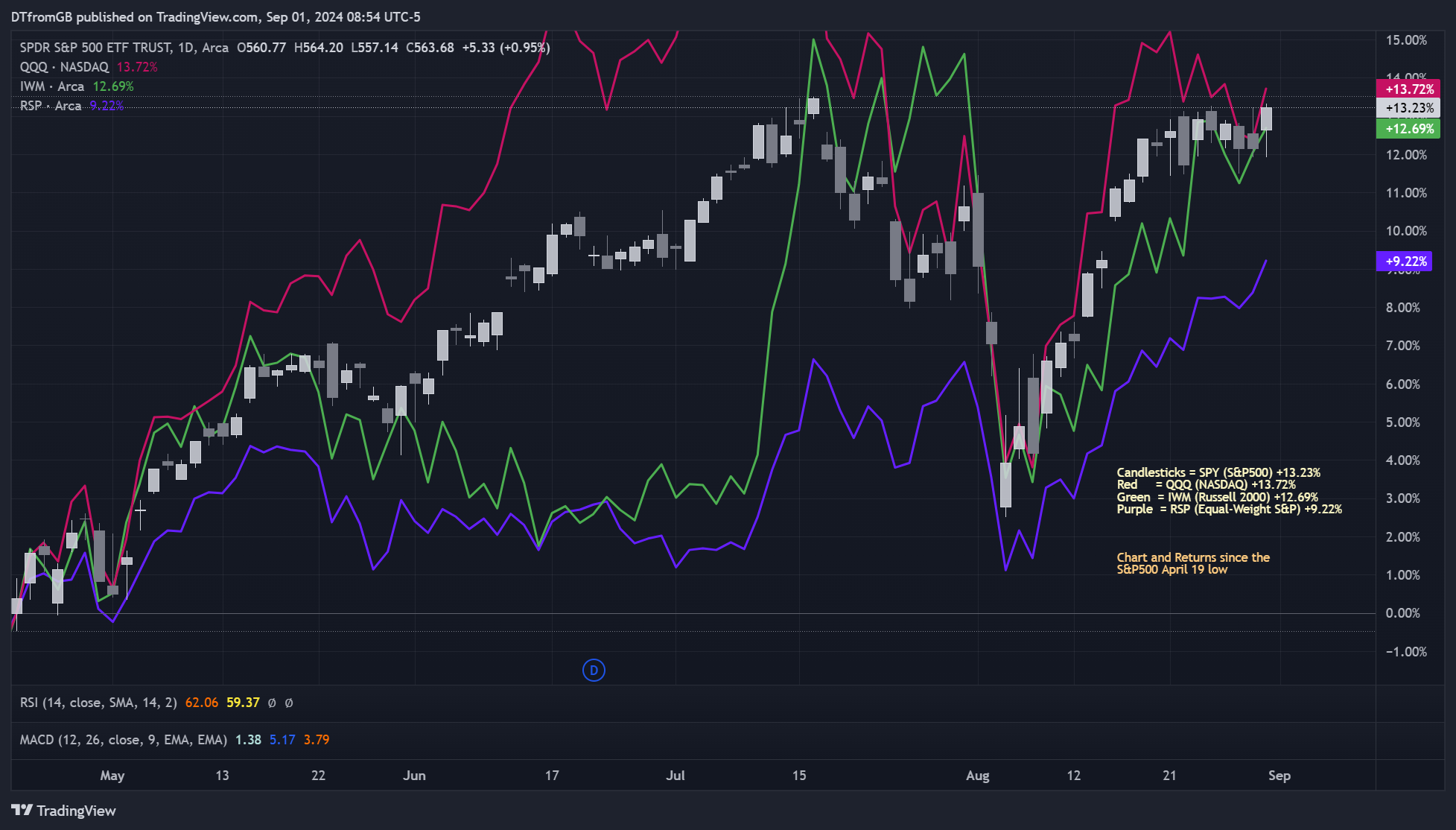 Below is a chart comparing the SPY (S&P500 Index in the white candles) with the QQQs (NASDAQ in red), IWM (Russell 2000 in green), and RSP (equal-weighted in purple) since the market lows in mid-April. SPY, QQQ, and IWM all have similar returns around 13% with the RSP up only 9.2%. However, RSP is the only one that has made new highs by the end of the month where the others have fallen short.