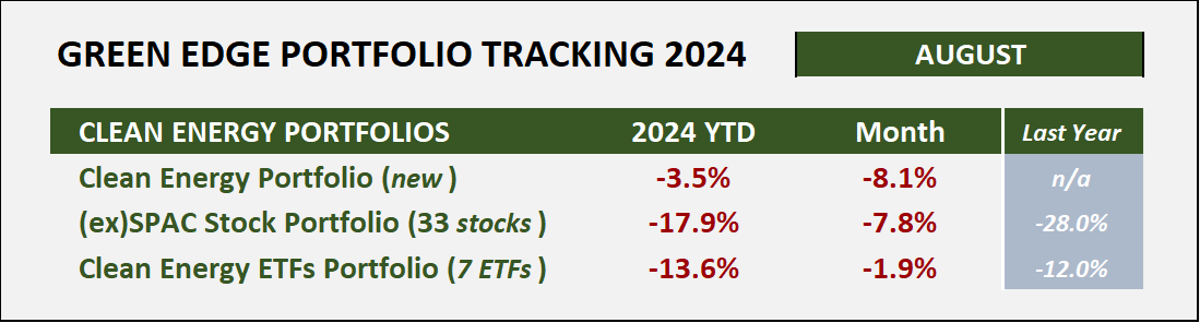 Clean energy stocks lose ground in August with the ETFs down -1.9%.