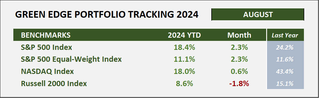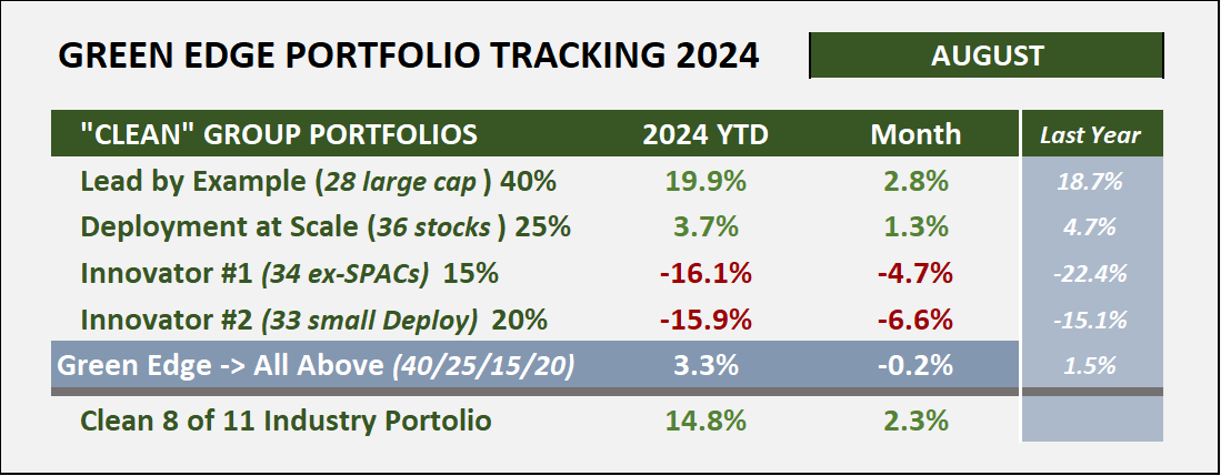 In our Green Edge groups, the Lead by Example portfolio continues to push performance over the S&P index — by +0.5% in August and +1.5% YTD.