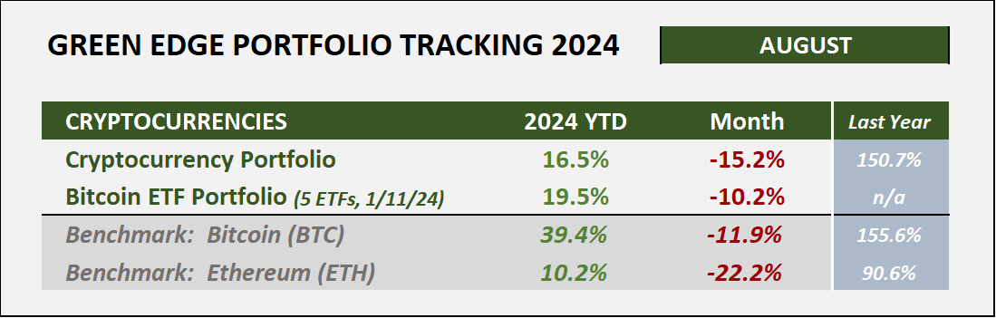 For the first time this year, the cryptocurrency portfolio of 10 tokens trails the S&P500 YTD, +16.5% versus +18.4%. However, Bitcoin remains the strongest up +39% YTD, although it retracted -11.9% in August.