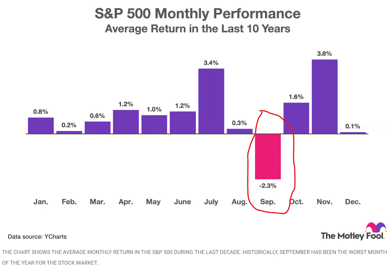 I love the fall, and September in Wisconsin has got to be the best weather month of the year. Fall sports of football and soccer get started —> you can smell it in the air. However, September has not been good historically for the stock market. Since 1928, the market has lost traction 56% of the time with an average loss of -1.2%. The recent decade has been even worse, 70% and -2.3% (see chart).